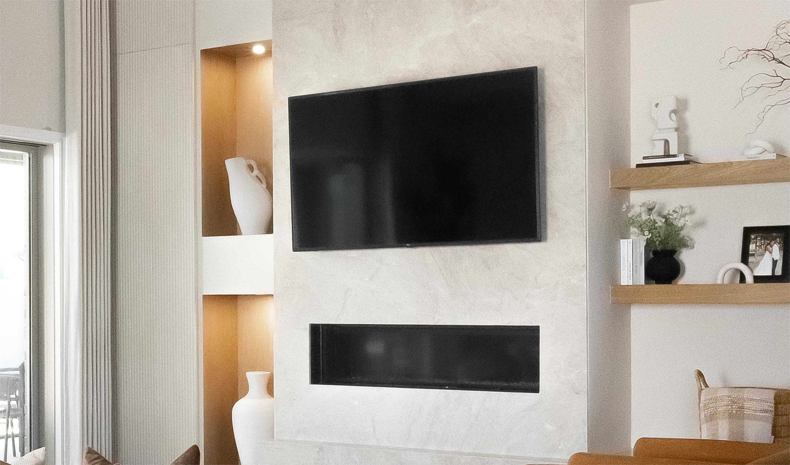The fireplace wall became the centerpiece, its towering stone finish framed by wood shelving and subtle décor. Paired with soaring ceilings and modern lighting, the outcome is a refined yet livable space that blends elegance with comfort.
